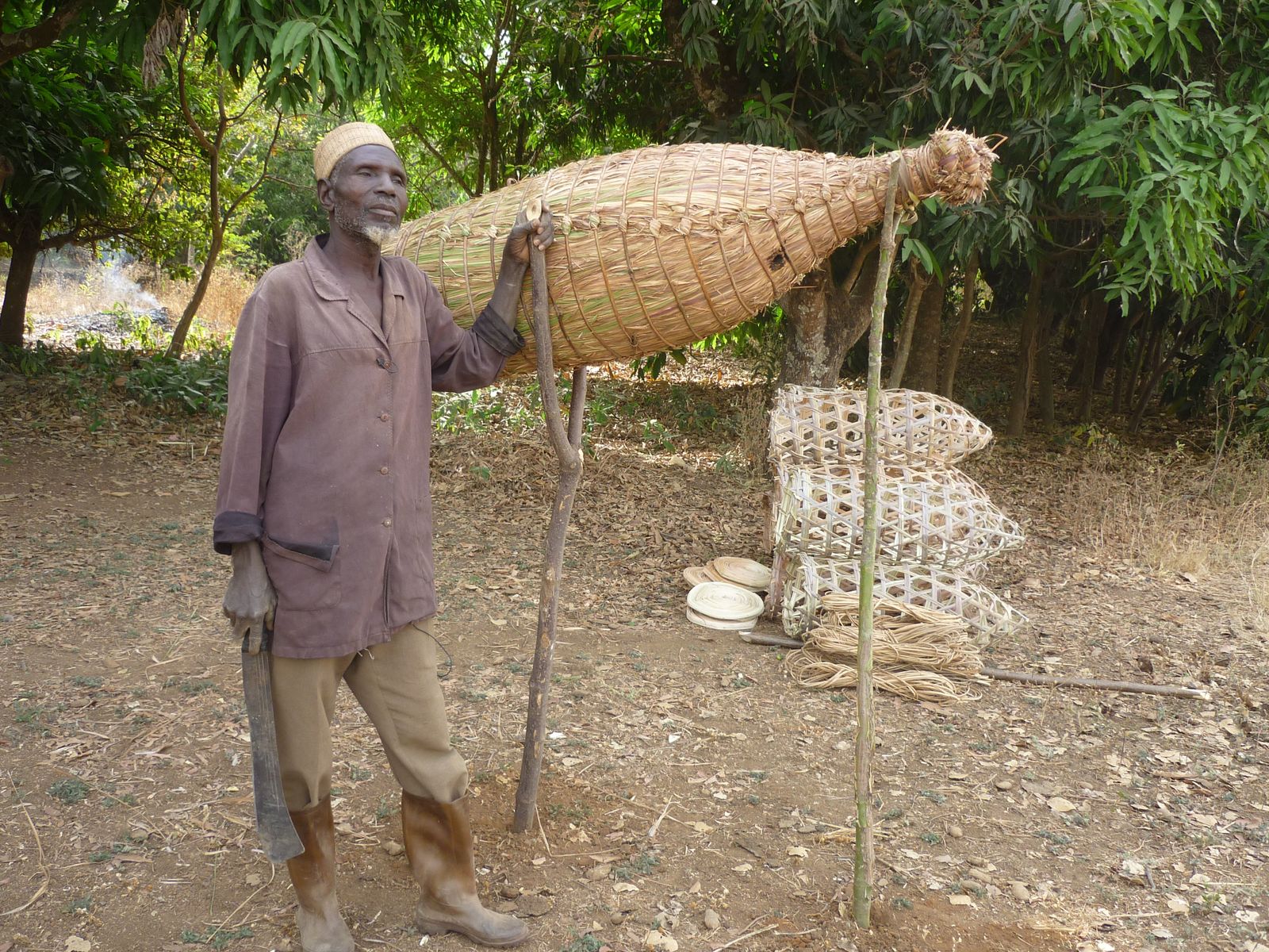 Abbildung: Bienenbehausungen werden in Kamerun kunstvoll mit der Hand gebaut. Sie hängen horizontal hoch in den Bäumen. So können schwärmende Bienenvölker eingefangen werden. Foto: Martin Gruber