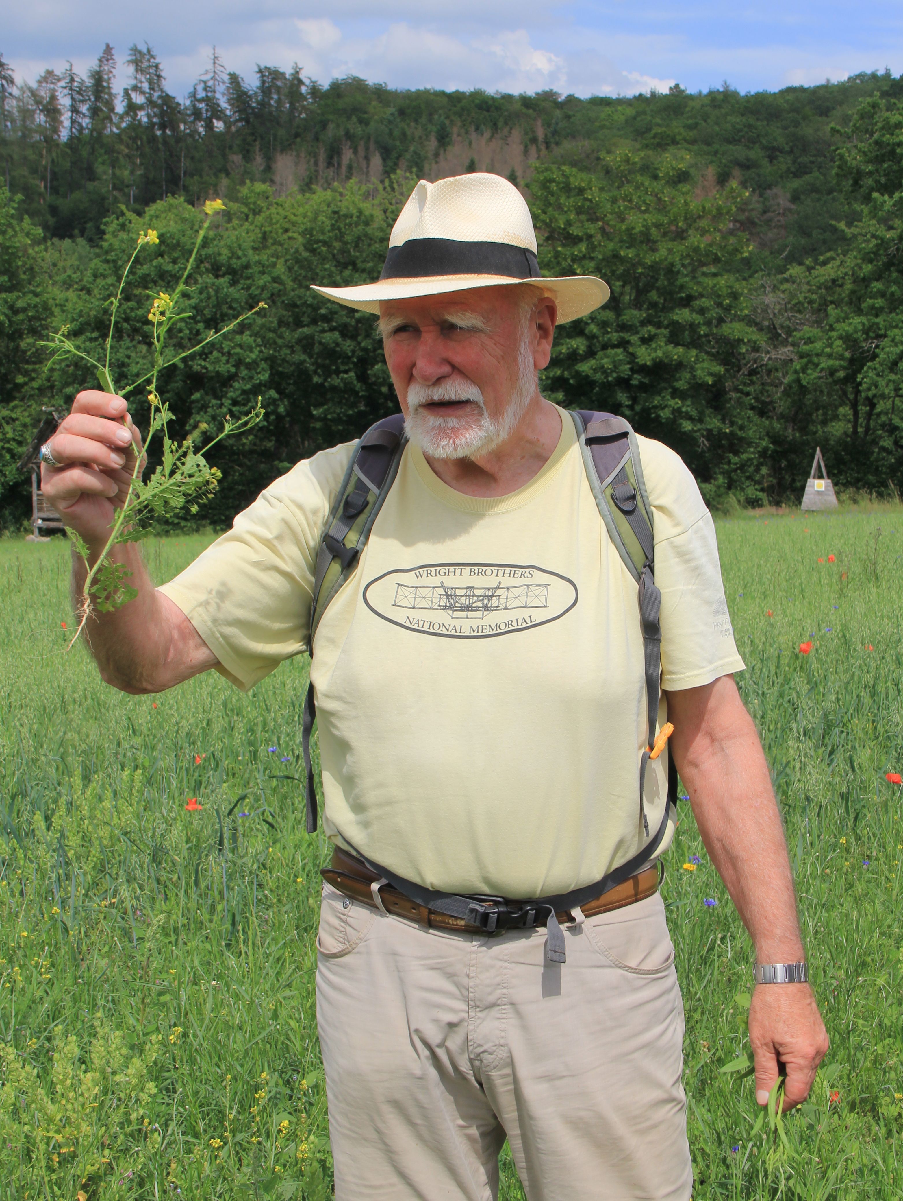 Den Schutzacker hatte die Bürgerstiftung Unser Land! Rheingau und Taunus im vergangenen Jahr als Rückzugsort für bedrohte Arten der Feldflur angekauft. Der Nassauische Verein für Naturkunde Wiesbaden hatte dafür neben zahlreichen privaten Spendern einen namhaften Betrag beigesteuert. Schon seit 2001 hatte der Kulturlandschaftsverein Hausen unter Anleitung von Dr. Wolfgang Ehmke am unteren Rand des Schutzackers einen zehn Meter breiten Streifen als Feld-Flora-Reservat angelegt. Dieser dient nun als Keimzelle für die Ausbreitung der Ackerwildkräuter auf der gesamten Fläche. Zusätzlich wurde jetzt am oberen Rand ein Streifen mit Acker-Wildkräutern wie Acker-Spörgel, Acker-Löwenmäulchen oder Acker-Vergissmeinnicht eingesät. Vom unteren Rand breitet sich auch die Saatwucherblume aus. „Eine große Kostbarkeit“, nannte Ehmke diese kräftig gelb blühende Pflanze, die er dort auf dem Acker schon seit den 1980er Jahren beobachtete. Mit dem roten Klatschmohn, dem roten Sandmohn und der blauen Kornblume zusammen bietet der Acker jetzt ein schönes buntes Bild, das auch zahlreiche Insekten anzieht.