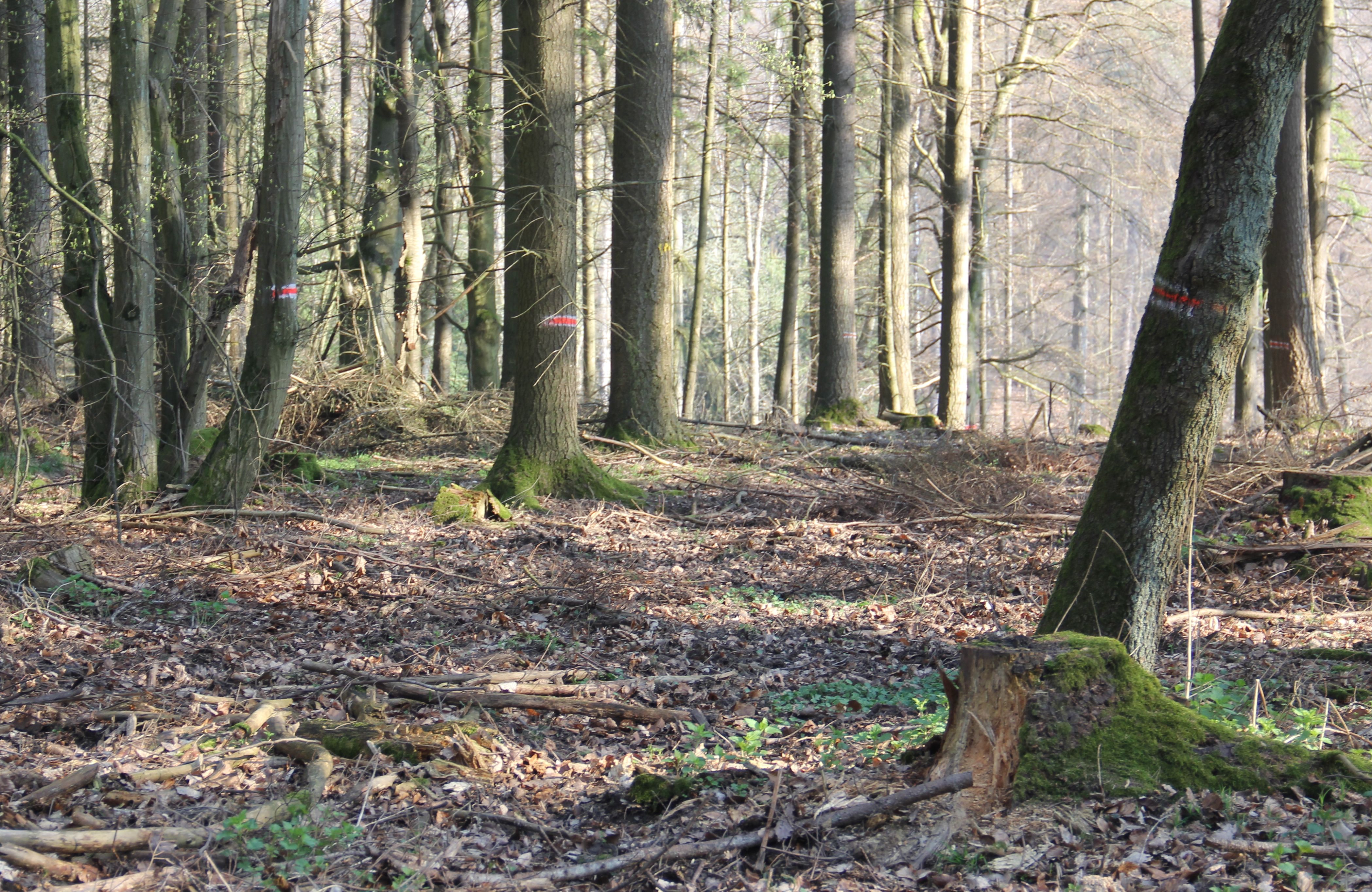 Rückegassen sind gekennzeichnet durch die weiß-rot-weißen Markierungen an den Bäumen.